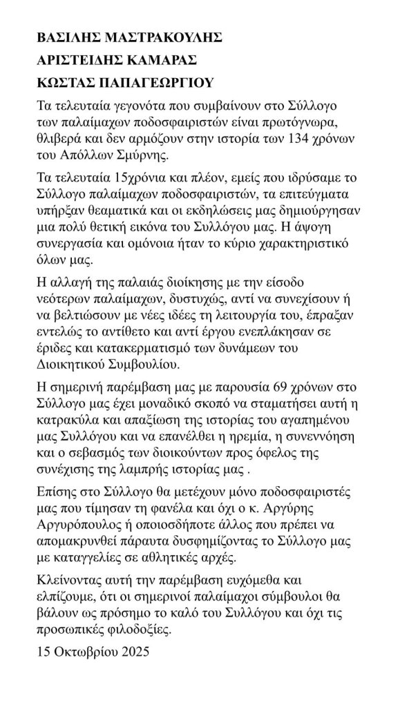 Σε αυτή την επιστολή (ΔΕΙΤΕ ΤΗΝ ΣΤΗΝ ΕΝΘΕΤΗ ΦΩΤΟΓΡΑΦΙΑ) με απαξιωτική διάθεση «αδειάζουν» τη νέα γενιά παλαίμαχων ποδοσφαιριστών που τους τελευταίους μήνες πήρε τα ηνία στο Σύνδεσμο Παλαιμάχων με νέο καταστατικό. Η επίθεση είναι ευθεία και γενική χωρίς να μπαίνουν σε ονοματολογία, εκτός από την περίπτωση του Αργύρη Αργυρόπουλου, τον οποίο ζητούν να απομακρυνθεί γιατί δεν ήταν ποδοσφαιριστής της ομάδας και γιατί έχει κάνει καταγγελίες για κακώς κείμενα του Ερασιτέχνη! Βέβαια οι συντάκτες της ανοιχτής επιστολής ξεχνούν πως πολλοί φίλοι τους δεν έπαιξαν ποτέ στην 1η ομάδα του Απόλλωνα αλλά ήταν και είναι μέλη των βετεράνων…